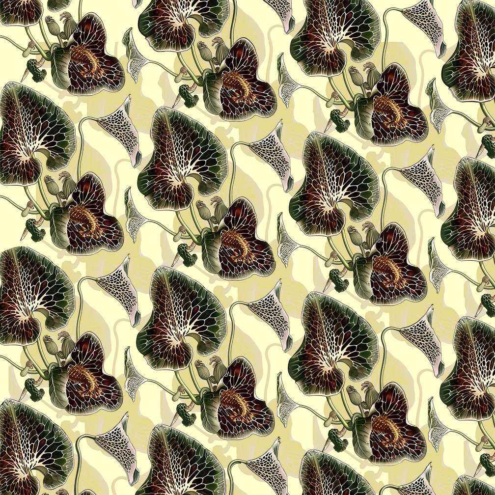 BLOOD ROOT is an innovative surface design by Elisabeth Trostli. It features a pattern of stylized buds, tendrils and leaves.