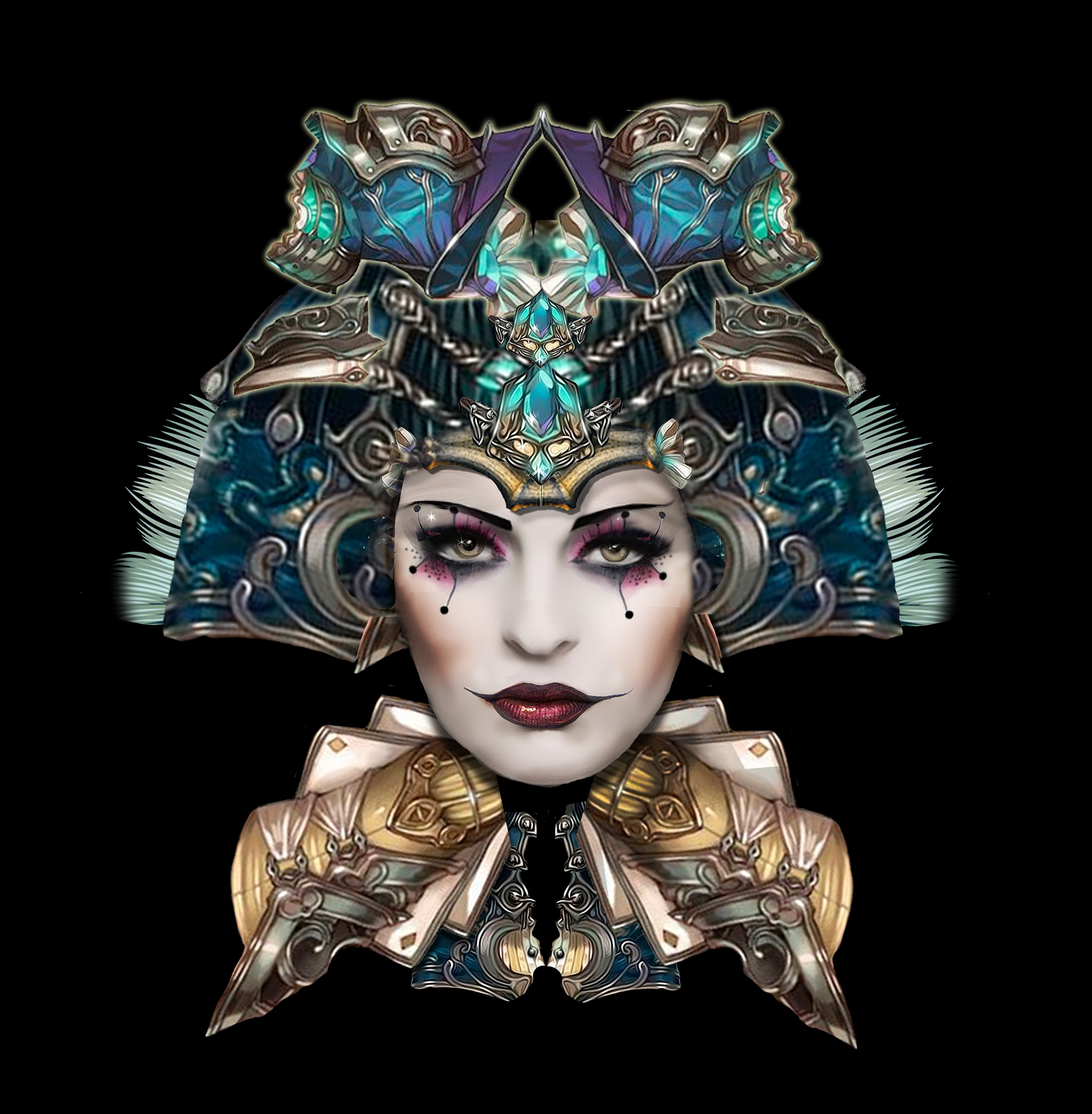 The Blue Plush Masque showcases an intriguing beauty, her violet eyes and dark red lips dramatically accented. She wears an intricate blue plush brocade hat