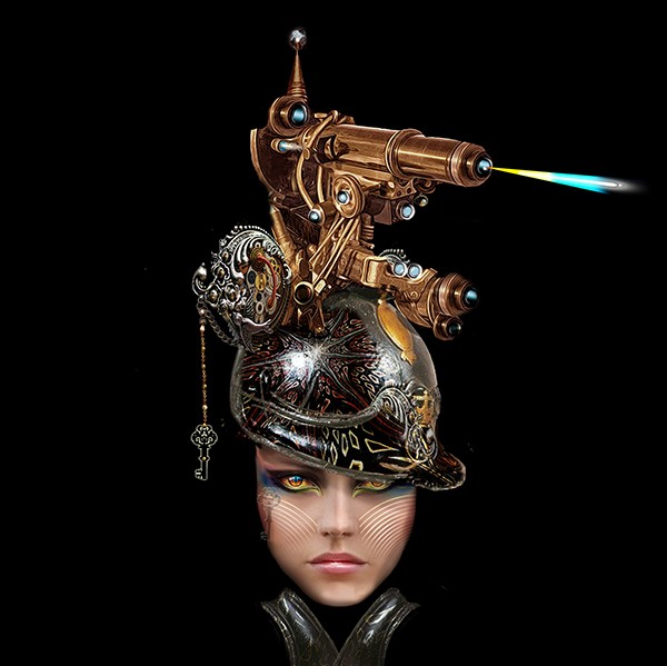The Laser Masque presents a mesmerizing portrayal of a fantasy woman warrior,her weapon of choice: A dazzling beam is emitted from a fantastical metallic laser-shooter atop her steel helmet.