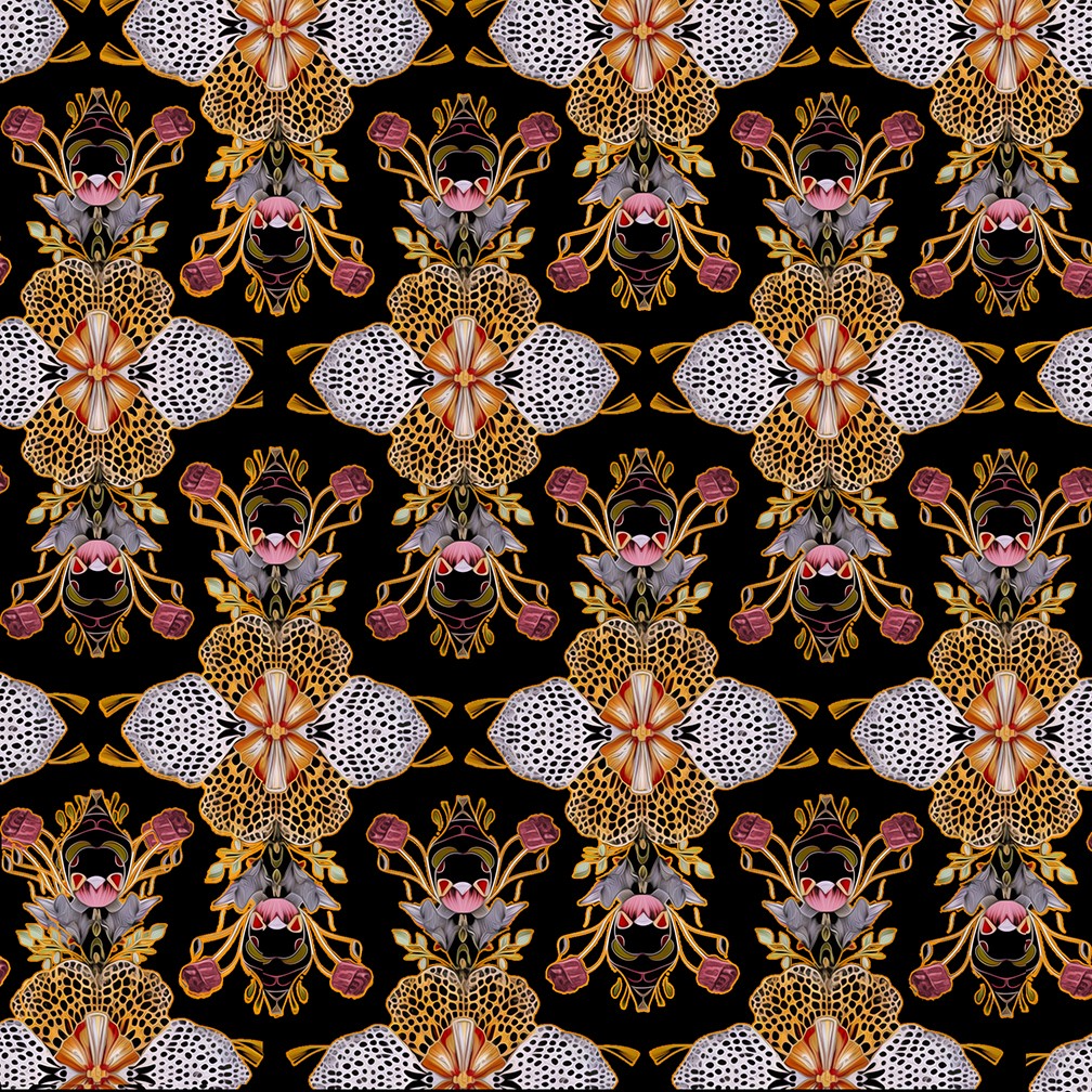 LEOPARD BUTTERFLY STRIPE (Pink) features an intricate leopard print / butterfly pattern with brightly colored flowers and symmetrical ornaments,