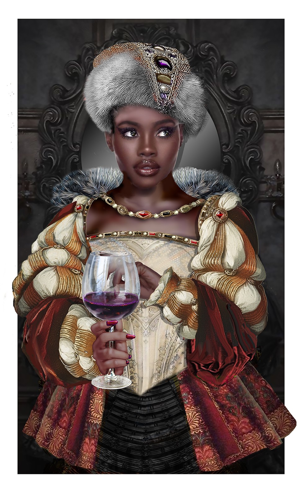 The dress, a regal shade red velvet with satin sleeves embellished with intricate golden embroidery. In her slender hands, she holds a goblet of rich red Merlot wine, its crimson depths catching the light and