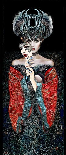 TATIANA holds a smiling mask to disguise her true feelings. She is dressed in a scarlet kimono over a fur-bordered vest.