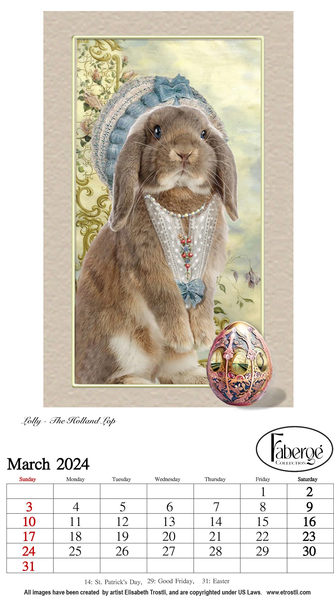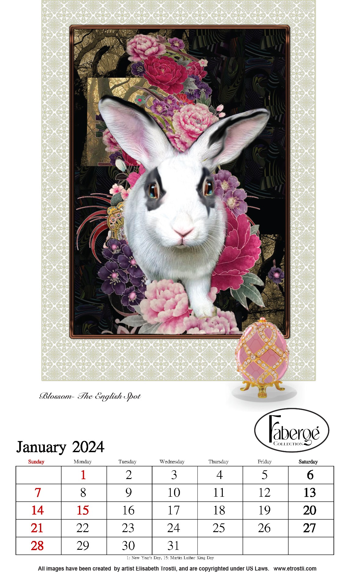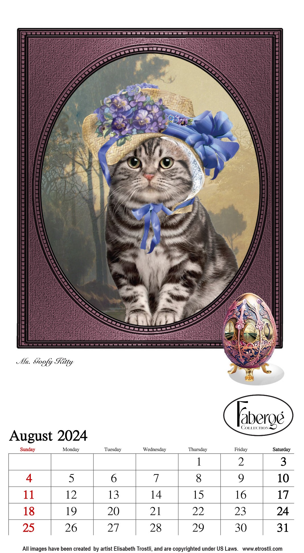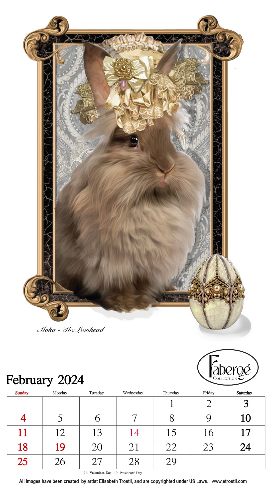 A unique calendar composed of 12 unique, adorable bunnies, cats and kittens dressed in period costumes and hats, digitally illustrated by Elisabeth Trostli.