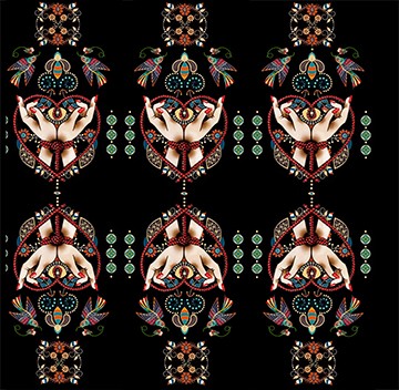 "Bird in Hand" is an original surface design pattern by digital artist Elisabeth Trostli. The pattern features tattoo-inspired hands bound by heart-shaped strings of red beads. Alternating offset colorful motifs include dainty coins, birds and flowers,