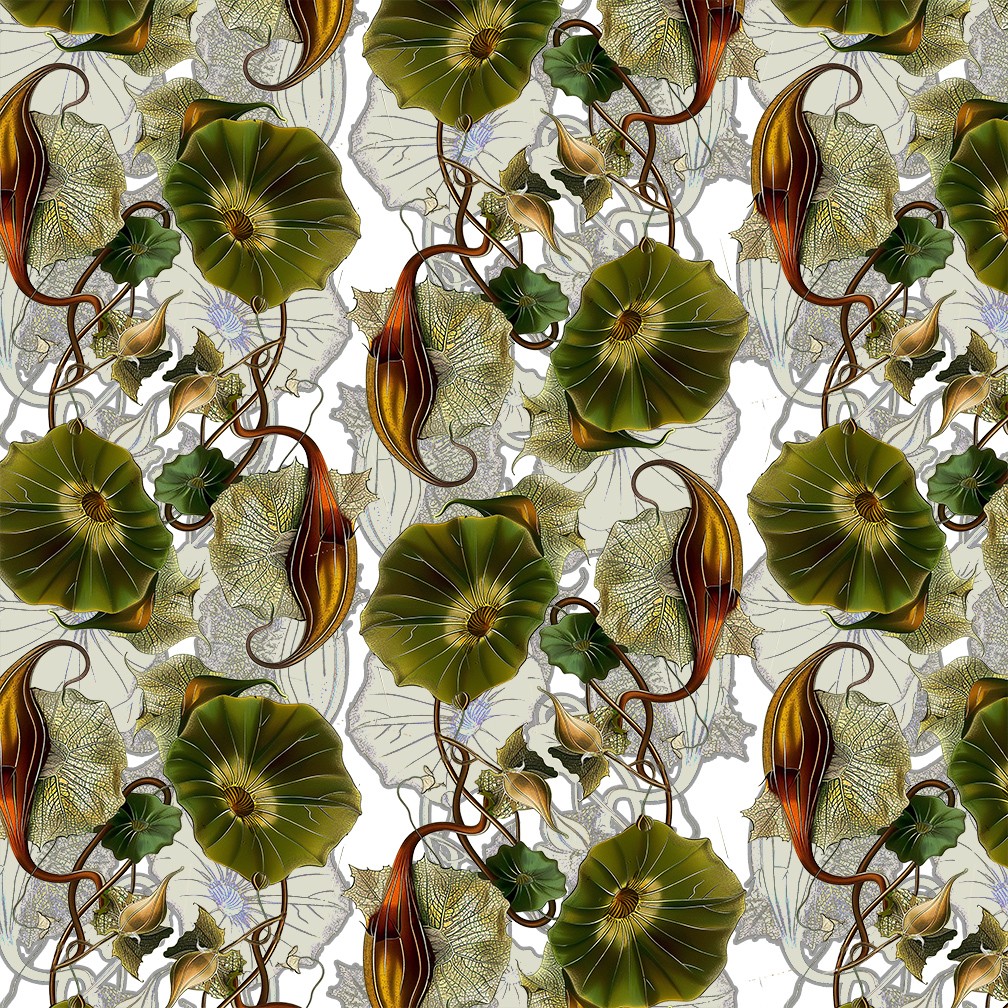 FRUITFUL VINE is an innovative surface design by Elisabeth Trostli. It features intricate allover iintertwined pattern of stylized fruit, tendrils and leaves. The background is an organic texture of pale greenshadow shapes against a cream background.