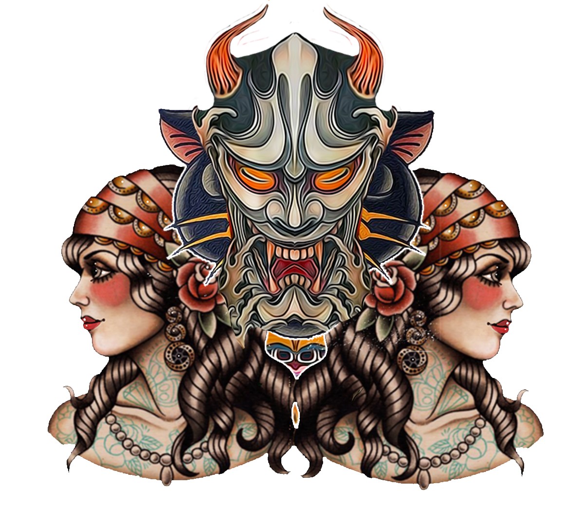 Symmetrical tattoo design featuring a central devil with glowing orange eyes horns. Positioned on either side, two black-haired gypsies donning red turbans adorned with coins enhance the overall aesthetic with their unique and intricate presence at the devil's shoulders.