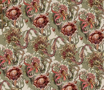 HUNGRY FLOWERS is an innovative surface design by Elisabeth Trostli. It features intricate Intertwined pattern of stylized carnivorous flowers and vining tendrils.