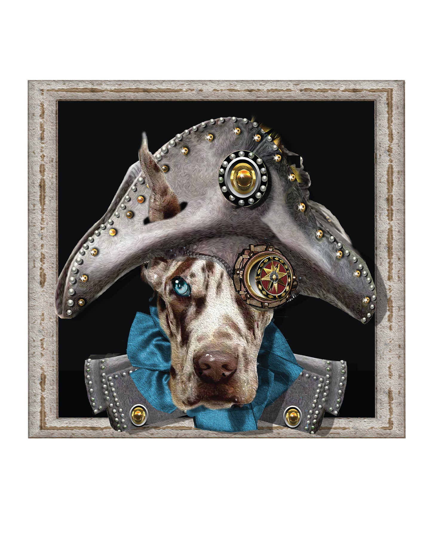 BLUE BOW is a Merlin Great Dane, and fancies himself a pirate, as can be seen from his elaborate hat, Steampunk goggles and medals. His blue eyes mirror his azure bow.