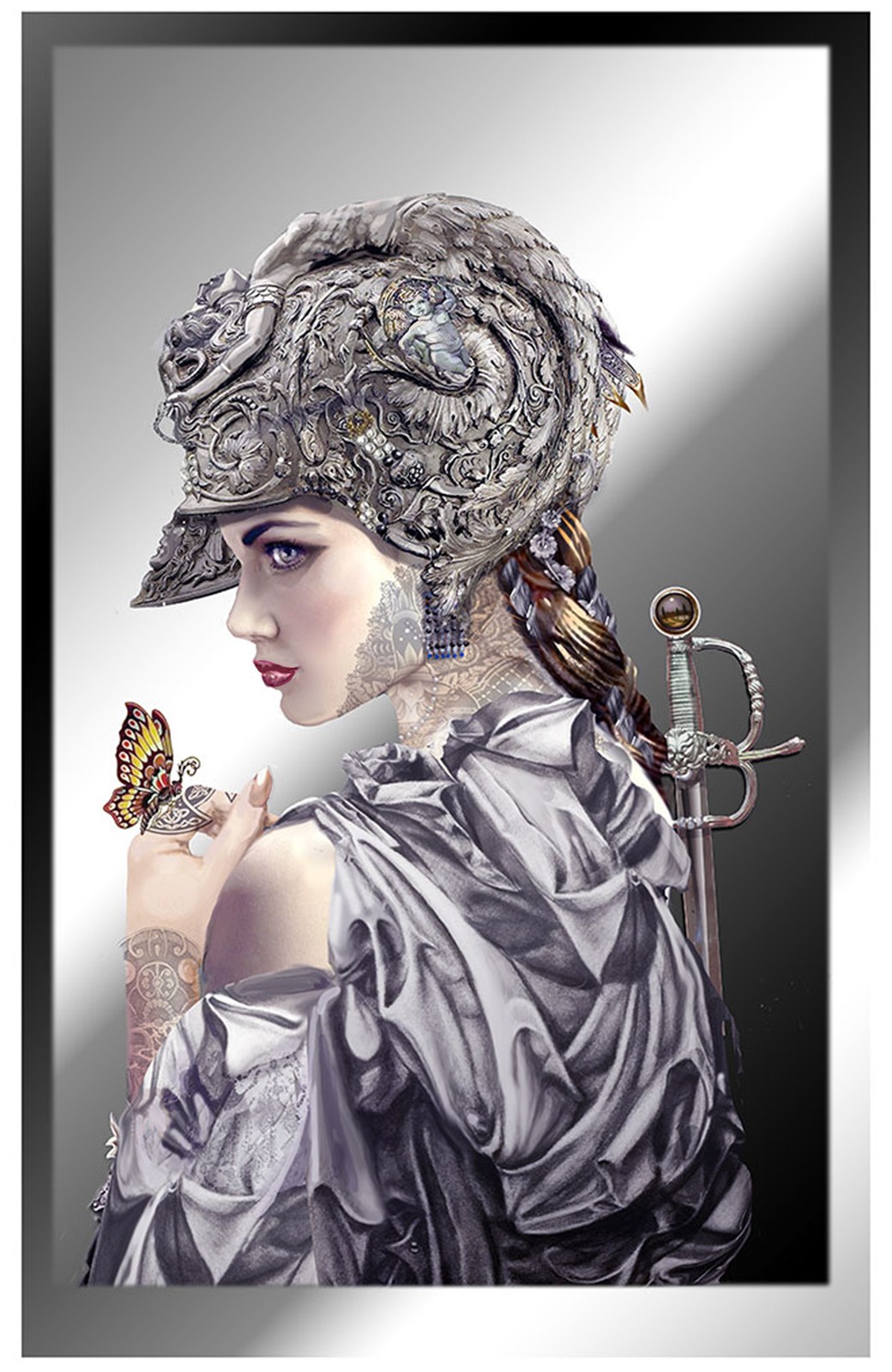Her ornate helmet and armour are made of silvery metal, as is her sword. She is adorned with lacy tattoos and draped in a silver robe, while a delicate butterfly is perched on her finger, the single trace of delicacy and spirituality pointing to her angelic origins.