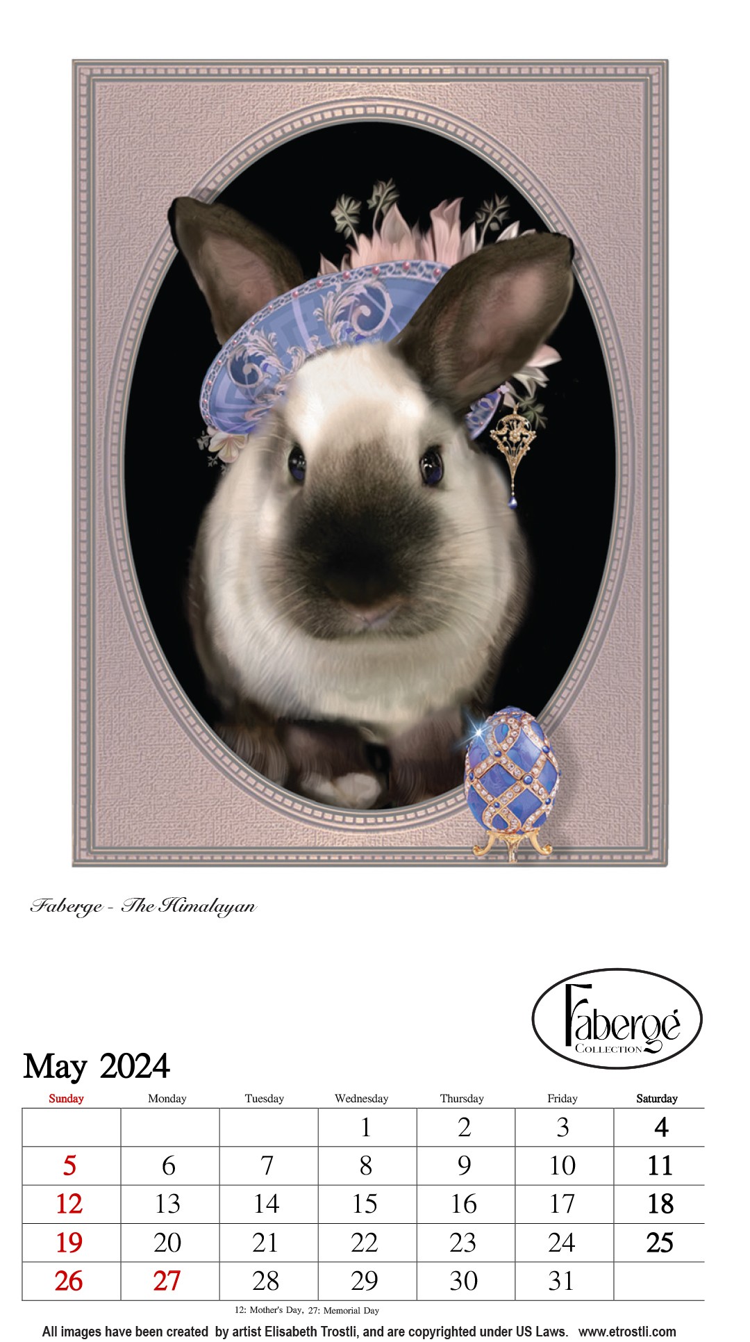 A unique calendar composed of 12 unique, adorable bunnies, cats and kittens dressed in period costumes and hats, digitally illustrated by Elisabeth Trostli.