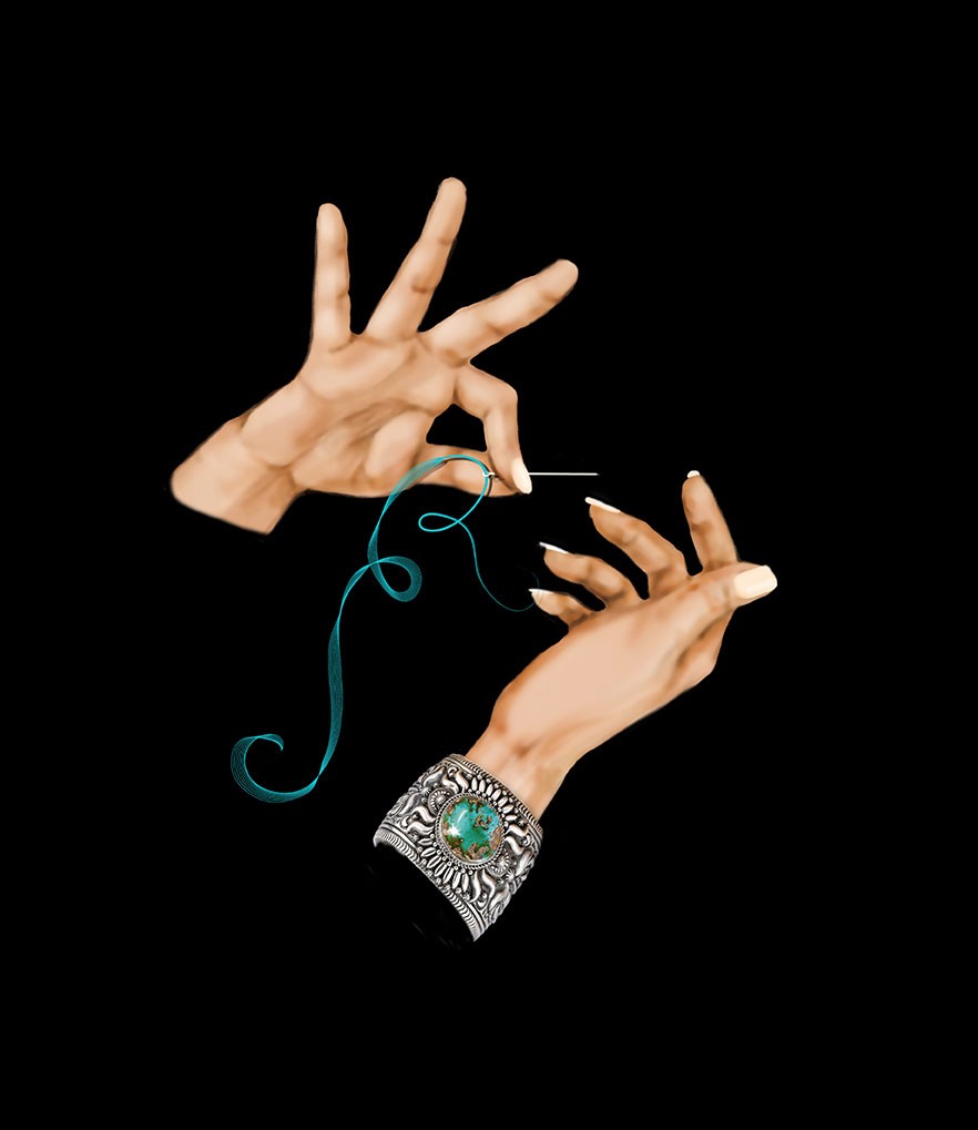 SHOW OF HANDS: Collection of women's hands showing various gestures and holding meaningful accessories. All images are digitally created by Elisabeth Trostli.