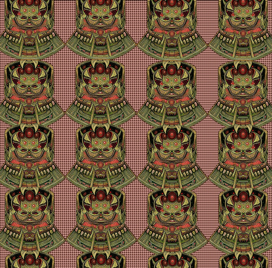 against a brick red background an evoke scales or chain mail found in traditional Samurai garb.