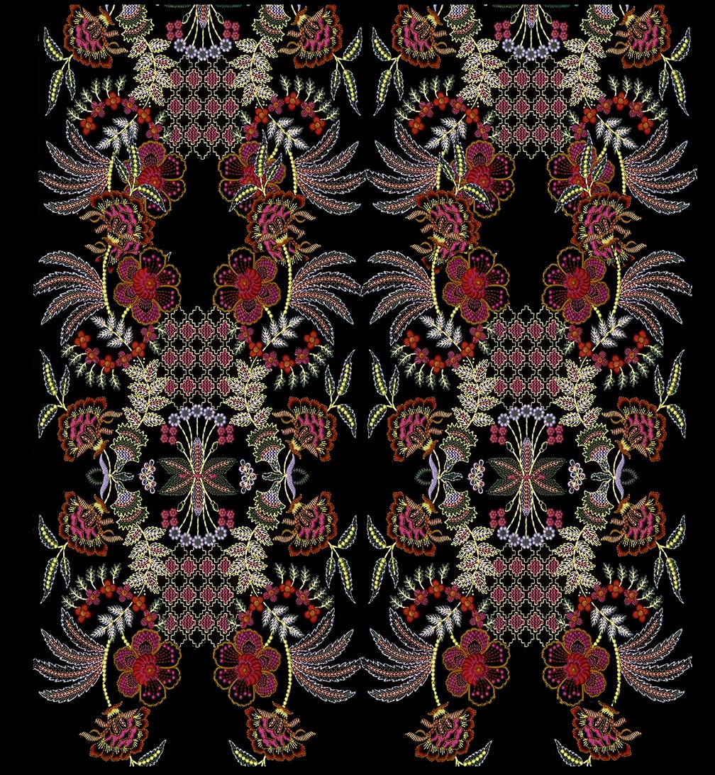 intricate embroidery designs in red, burgundy, cream and lavender hues, on a black fabric background, using a cross-stitch technique.