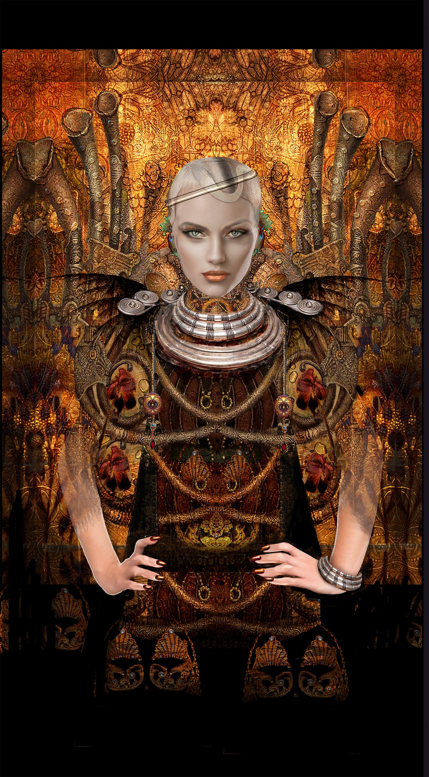 a striking figure, with captivating pale eyes and exotic attire, emerges boldly from the natural surroundings. The artwork masterfully combines shades of orange, browns, blonde,